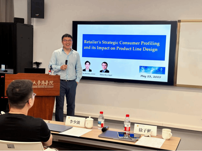 随后,香港城市大学徐子彬副教授做主题报告Product Line Design with Strategic Consumer Profiling,该研究关注数字营销中的品牌建设与管理问题。他指出,在数字化时代,品牌形象的塑造和传播方式发生了巨大变革,品牌需要通过多渠道整合营销来提升品牌知名度和美誉度。徐教授详细解读了如何依据消费者、零售商和制造者的特征进行产品线的优化设计,助力企业实现精准营销与市场细分,提升产品在市场中的竞争力。