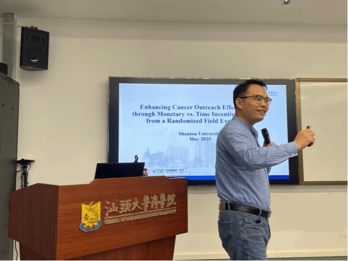 接着,浙江大学杨浙帅研究员做主题报告Enhancing Cancer Outreach Effectiveness through Monetary vs. Time Incentives: Insights from A Randomized Field Experiment,通过聚焦癌症筛查参与意愿这一前沿领域,创新性地对比了货币激励与时间激励对推广癌症筛查项目的效果差异。通过精心设计的随机田野实验,他发现,时间激励的效果优于物质激励,这一结果为促进农村癌症筛查项目的普及提供了新的思路与方法,引发了嘉宾和观众们的热烈讨论。