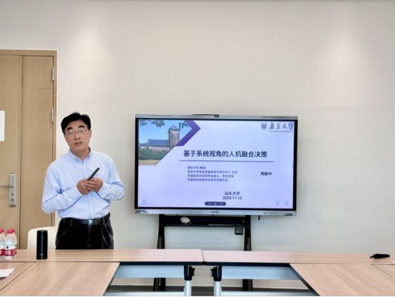 讲座伊始,周教授以“无人机系统”为例,引出系统思维的基本概念与核心思想,并指出生成式人工智能(GAI)是具备系统思维能力的机器学习技术,其与人类智能的融合能够形成“提示—响应—反馈—调整”的持续优化决策过程。随后,他围绕“人件技术”与“智能博弈决策”两大主题,系统阐述了人机融合(HAI)模型的构建思路、HAI对博弈智能的增强机制,以及HAI在提升博弈决策效果中的关键作用,为师生勾勒出智能融合领域清晰而前沿的研究路径。