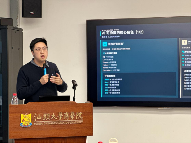 随后,法学院王伟林博士带来题为《AI辅助科研写作——从解构文章到文章生成》的专题分享。王老师指出,AI不应替代研究者的原创思考与学术创作,但可作为研究助手、方法教练与质控协同角色,为科研写作提供有力支持。他进一步提出,在科研写作中应遵循“人先定—AI做—人复核—AI做—人负责”的合规工作流程,秉持“人类主导、AI辅助、迭代循环”的原则,实现高效、可靠的写作协同。分享过程中,王老师还向在场师生演示了提示词拆解与优化等实用技巧。