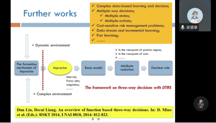 梁老师从机器学习缺乏可解释性的制约背景出发,提出可解释性机器学习的需求,并强调三支决策近些年作为一种新型的可解释性模型得到了学术界的关注。梁老师的报告主要分为四部分,首先详细阐明三支决策主要思想及介绍三支决策规则获取的基本理论模型,并梳理三支决策的发展动态轨迹。其次,基于不同粒度表征场景,讨论决策规则获取中风险损失的偏好学习方法。接着围绕属性信息、对象和损失信息存在偏好异质性、决策区域与需求不一致、损失函数的冲突问题等几个主题分享面向风险损失异质信息的三支规则获取,分析三支决策规则的冲突并提出相应的信息融合策略,最后讨论与管理密切相关的研究应用。