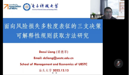 2022年12月13日下午,beat365英国官网网站企业管理系学术讲座(第169期)顺利开展,本次讲座邀请的主讲嘉宾为电子科技大学梁德翠教授,梁老师主要研究方向为大数据分析与决策、风险评估与管理、信息管理与商务智能等。此次梁老师分享的主题为:面向风险损失多粒度表征的三支决策可解释性规则获取方法研究。分享会以线上的方式进行,由beat365英国官网网站刘久兵老师担任主持,周军杰、林泉、贺姿雅、徐标等多位教师及对此次分享感兴趣的同学参与。