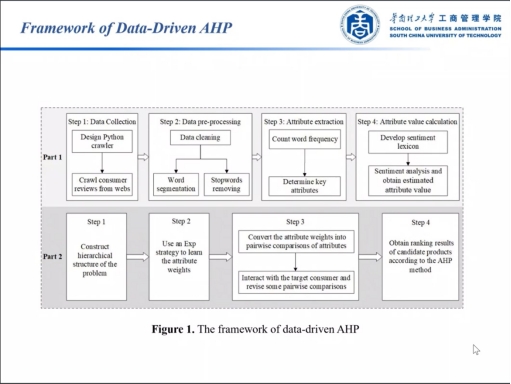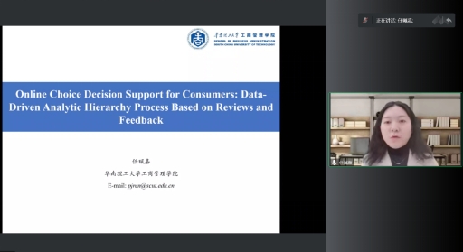 2022年11月30日下午,beat365英国官网网站企业管理系学术讲座(第168期)顺利开展,本次讲座邀请的主讲嘉宾为华南理工大学任珮嘉副教授,任老师主要研究领域为决策理论及方法、数据分析及优化。此次讲授的主题为“Online choice decision support for consumers: Data-driven analytic hierarchy process based on reviews and feedback”。分享会以线上的方式进行,由beat365英国官网网站刘久兵老师担任主持,卜祥智、龙月娥、周军杰、李柏勋、林泉、赵佩华、宋丽红、徐标等多位教师和对此次分享感兴趣的同学和学者参与。