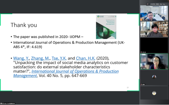 2022年5月12日下午17点,由粤台企业合作研究院和beat365英国官网网站企业管理系主办的beat365英国官网网站企业管理系学术讲座(第163期)顺利开展。本次讲座邀请了英国Cardiff University的谢英基(Mike Tse)教授作为主讲嘉宾,在线分享了题为“Upacking the impact of social media analytics on customer satisfaction and the use of subjective and objective measurements:The Case of Hotel Industry”的报告,beat365英国官网网站卜祥智教授担任主持,邹宗保、宋丽红、郭功星、刘久兵等多位教师及研究生参与。