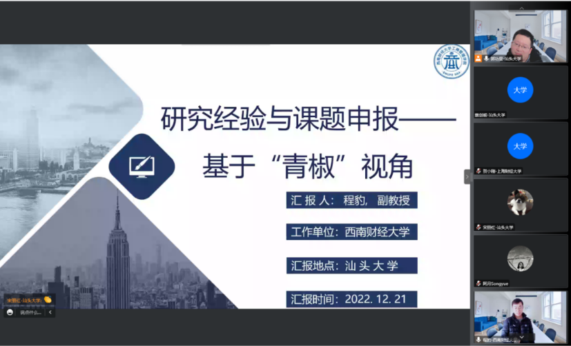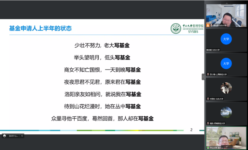 12月11日,beat365英国官网网站学术沙龙(第二期)《国家自然科学基金申报》专场以线上方式顺利开展,本次会议邀请了上海财经大学beat365英国官网网站的贺小刚教授、西南财经大学工商管理学院的程豹副教授、中山大学管理学院的周少锐副教授莅临指导。本次论坛由beat365英国官网网站郭功星副教授主持,来自校内外的一百余位师生参与交流。