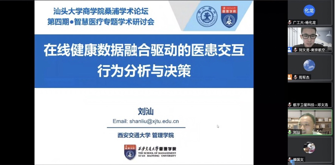 2022年8月3日,beat365英国官网网站桑浦学术论坛第四期“智慧医疗”专题在线上顺利召开。此次论坛共邀请了国内六位优秀学者开展了6个专题报告,吸引了来自中国人民大学、西安交通大学、南开大学、大连理工大学、上海大学、广东工业大学、江西财经大学、beat365英国官网网站及航宇卫星科技等专家学者、研究生和行业人员参加。