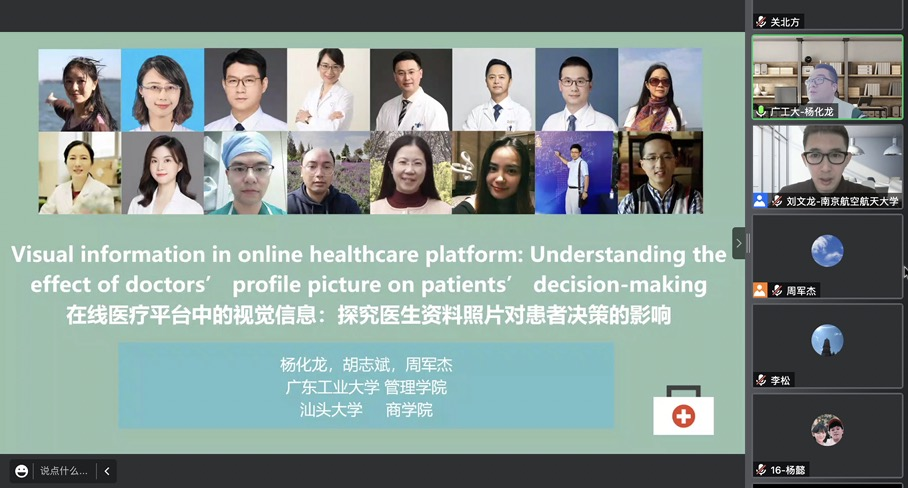 第一场报告由广东工业大学管理学院杨化龙副教授主讲,主题为“在线医疗平台中的视觉信息:探究医生资料照片对患者决策的影响”。杨化龙副教授首先与老师、同学们进行互动,通过照片选择医生,进一步说明医生资料照片对患者决策会影响,并且详细介绍了在线医疗的发展背景及先前的研究、在线医疗方面的研究,由此为了填补以前研究的不足,他的研究基于行为实验和实证研究,探究医生在线照片对于患者关注和择医选择的影响。杨化龙副教授指出,在线医疗平台中患者和医生无法进行面对面的交互,因此患者对医生的印象源自于医生的着装和背景,并可由此来影响患者的决策。通过预实验、正式实验及后验分析,对医生的着装及其背景对患者决策的影响进行了分析。同时,运用计量模型分析通过好大夫网站收集的研究数据,运用面板数据建立计量实证模型,进一步分析医生的在线照片对患者关注恶化择医选择的影响,建立双回归方程,并通过固定效应模型进行分析。