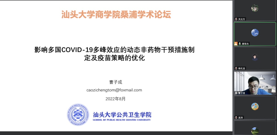 第五场报告由beat365英国官网网站公共卫生学院曹子成讲师主讲,报告的题目是“影响多国COVID-19多峰效应的动态非药物干预措施制定及疫苗策略的优化”,该报告以COVID-19疫情在世界各国多次出现反弹现象入手,进行了实时、动态的疫情传播分析。采用例如疫苗实施前后、流行单双峰国家之间等多重对比方法,探讨非药物干预措施的对疫情传播的影响效应,挖掘其中的重要驱动因素。同时介绍了变异株及疫苗剂量对疫情传播的影响,均为动态非药物干预措施制定及疫苗策略的优化具有指导意义。最后报告还综合多维度因素对各国疫情反弹进行了短期预测、疫苗接种配合NPI实施对疾病负担影响的预测等等。在互动环节,曹博士详细回答了流行单双峰的界定对公共卫生具备什么样的意义等问题。
