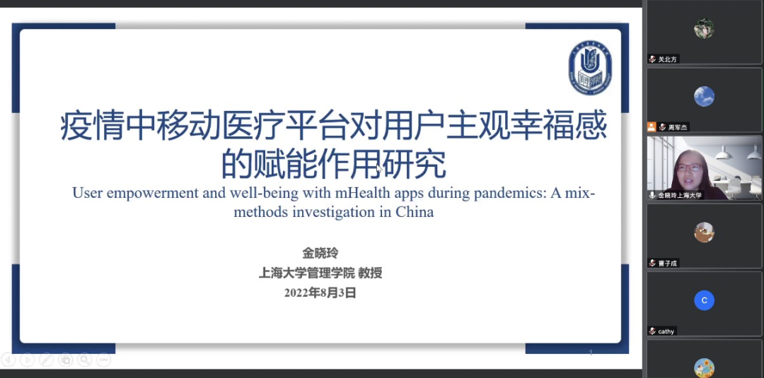 第四场由上海大学管理学院金晓玲教授主讲,主题为“疫情中移动医疗平台对用户主观幸福感的赋能作用研究”。本次报告主要探讨了疫情背景下移动医疗平台的赋能机制问题,创造性地提出了“移动医疗用户的心理赋能”(PEMU)的概念,通过定量-定性的顺序混合研究方法发现,PEMU受感知反应效能、易用性以及移动医疗平台质量三种技术因素的驱动,作用于用户的主观感知——产生活力或缓解压力。进一步研究发现在此作用机制中,事件的关键性具有显著的调节效应。这一研究极具理论和现实意义,有助于推动移动医疗平台的完善和发展。