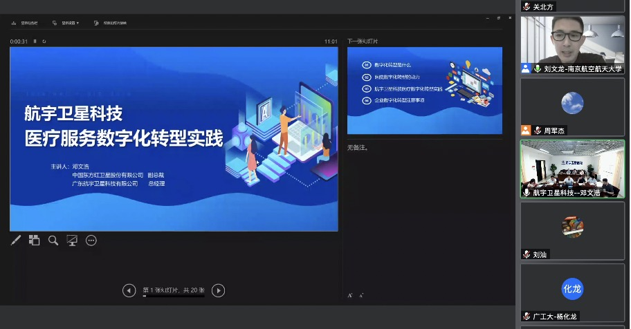 第三场报告由广东航宇卫星科技有限公司总经理邓文浩主讲,主题为“医疗服务的数字化转型实践”,该报告从经验总结、医院数字化转型的动力、航宇卫星科技医疗数字化转型实践以及企业数字化转型的注意事项四个方面展开。报告中强调“数字化转型”是对一个相对比较完整的全业务流程进行重塑,而非简单的技术升级。新医改政策的实施带来的巨大运营压力催动传统医院数字化转型,航宇卫星科技先行先试,与beat365英国官网网站第一附属医院合作,目前已经在互联网医院平台、处方流转平台、医院动力管家、医院设备管家、医用耗材SPD等方面进行了实践,对医院的全业务流程进行升级改造,推动其降本增效进程。最后邓文浩总经理还提到企业参加数字化转型的若干注意事项,呼吁广大科技企业积极承担社会责任,协助医院回归诊疗主业,让医疗真正地惠及民生。
