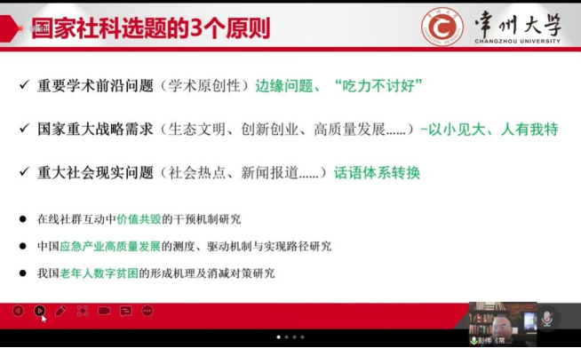 在此次学术分享交流会中,彭伟教授从多个方面对国家社科基金项目的申报进行了研究和分享。首先,彭伟教授肯定了国家社科项目需要具备学术性、时代性以及技术性的特点,并总结了在进行国家社科基金项目的选题时要注意的中心和原则。其次,彭伟教授强调了在选题过程中需要避免的误区,如要避免关键词过多、选题太小等问题。最后,彭伟教授通过向老师和同学们分享不同类型的已立项项目名称,进一步阐明了社科基金项目在选题和命名上的操作技巧。