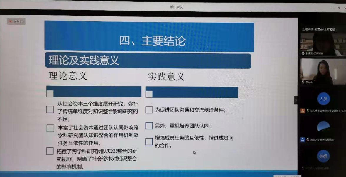 除了专题报告与点评,与会人员还就研究问题发现、研究理论、研究设计、实证研究及方法等开展了积极的互动与交流,贡献了一场高水准的学术盛宴,吸引了山东大学、对外经济贸易大学、河南大学及河南中医药大学等兄弟院校老师和同学的参与,并得到了他们的正面评价和积极肯定。