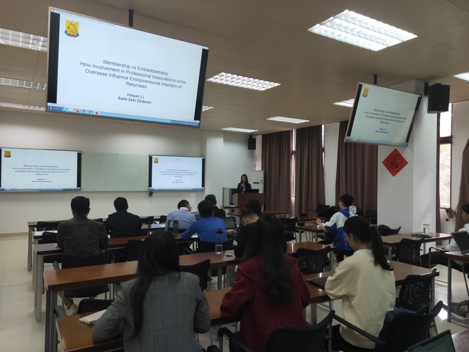 2020年12月2日下午,beat365英国官网网站企业管理系双周学术讲座在beat365英国官网网站三楼研讨室举行。本次讲座由本系李海燕老师主讲。李老师分享了题为《会员vs嵌入:海外职业协会的参与如何影响海归创业意图》的学术报告。beat365英国官网网站周军杰老师、郭功星老师、孟书老师等教师和beat365英国官网网站研究生参与了本次讲座。