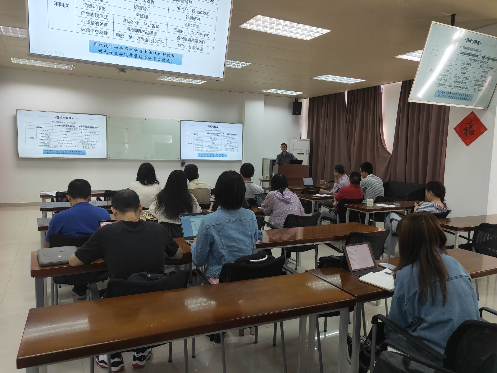 首先,朱镇教授介绍了研究背景和研究问题,通过电商平台实例和在场师生进行讨论。随后,朱镇教授详细阐述了有关研究的理论和假设。之后,以携程网调整质量披露策略为研究关键事件,朱镇教授构建了以出境游产品在线销售为例的长短期非平衡面板数据,并对数据模型因变量、自变量、调节变量和控制变量进行一一介绍。最后,根据模型计算结果和检验,朱镇教授对两种质量披露机制的作用机理进行了分析,对如何更好发挥质量背书作用和提升电商平台产品质量治理进行了探讨。