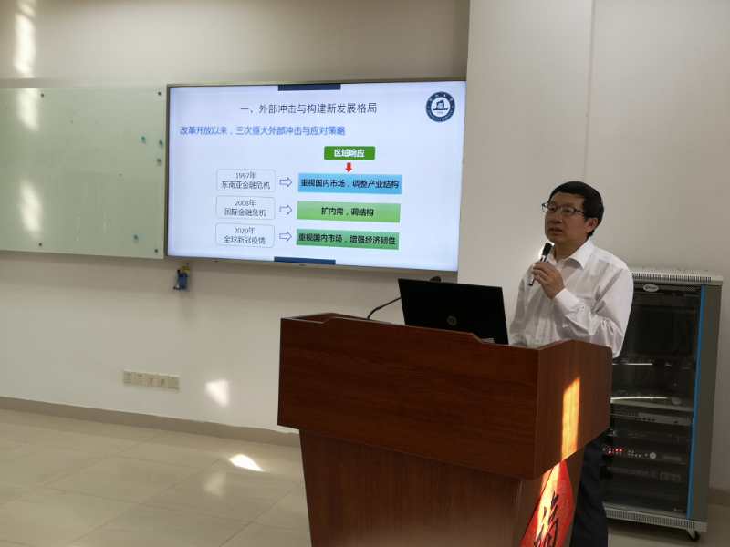 覃成林教授从国内外经济社会发展的新变化讲起,他指出,一方面新冠疫情加速了世界经济发展格局的重塑,另一方面国家开始大力构建以国内大循环为主体、国内国际双循环相互促进的新发展格局。在此基础上,覃成林教授分析了新发展格局下粤港澳大湾区建设与《粤港澳大湾区发展规划纲要》编制时的不同。覃成林教授进一步指出粤港澳大湾区建设应该积极应变,特别是发挥深圳、广州的带动作用,积极参与国内大循环,提高粤港澳大湾区经济韧性,实现大湾区高质量发展。本次学术报告中,覃成林教授回答了在场师生的提问,对粤东四市如何在粤港澳大湾区建设中获得更多发展机遇等问题进行了交流,现场气氛十分活跃。