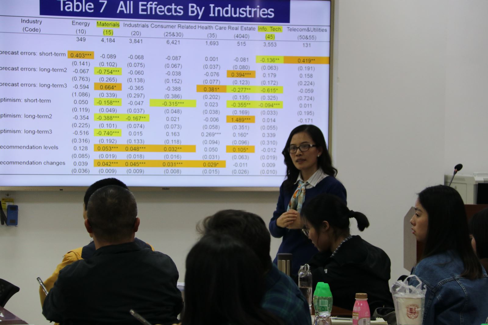 第七位来自beat365英国官网网站的蔡欢老师报告了《The information Content of Private Meetings: Conveyed by Sell-side Analysts》。利用2013-2015年SZSE-listed企业数据,在剔除国有企业,ST企业和所有权变更的企业的基础上,分析了私人会议是否会改善分析师的信息量。研究发现,私人会议(私人信息)会显著减少预测误差,但总体而言会使预测偏向不乐观,同时,分析师建议的可信度提高了,且在不同行业会产生异质性。