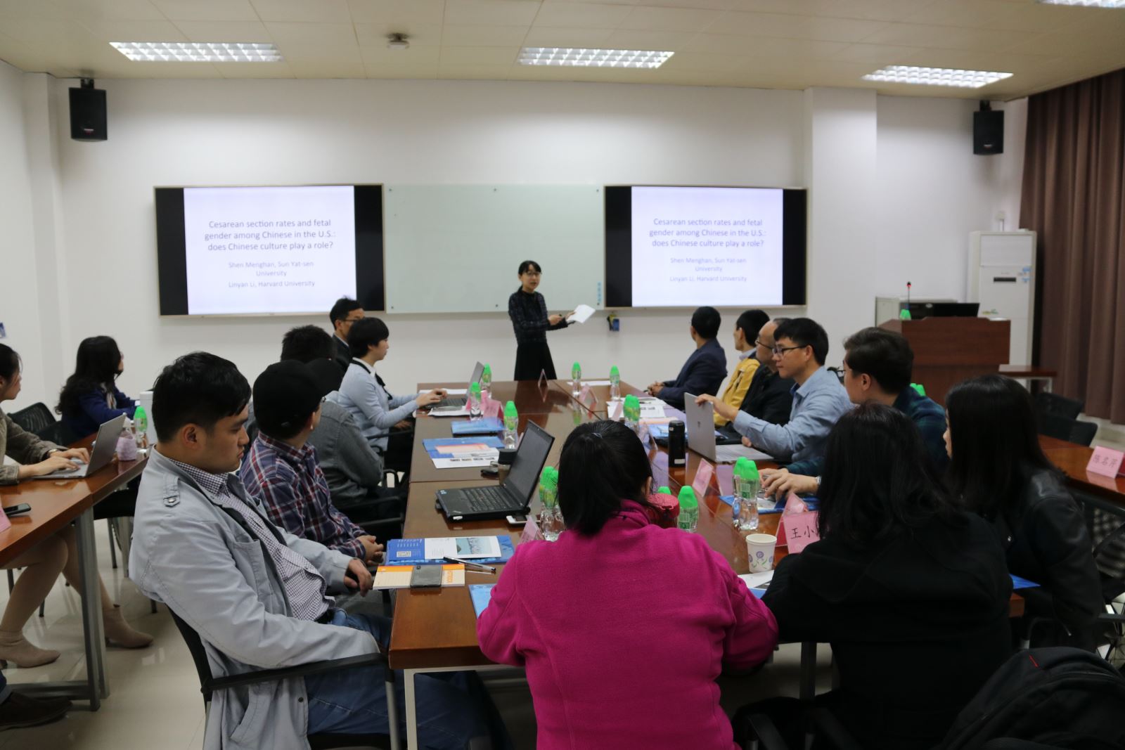 第一位来自中山大学的申梦晗老师报告了《Cesarean section rates by fetal sex among U.S. China women: Evidence from birth certificate data》。申老师使用了美国1990-2000年的妇女生育数据,使用双重差分法识别了中国文化尤其是男孩偏好与剖腹产的关系。研究发现,相比预期会生女孩的日本妈妈,中国妈妈的男孩偏好更有可能会选择剖腹产的生育方式。该效应在外国出生和高学历的母亲以及孩子父亲也是亚裔的家庭更为明显。一个可能的解释是,当得知是男孩时,营养进补会更多,容易提高出现超重婴儿的概率。