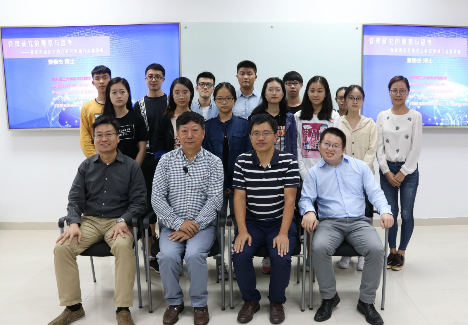 2018年10月17日, beat365英国官网网站企业管理系双周学术讲座在beat365官网三楼学术研讨室举行,华东理工大学beat365英国官网网站市场营销专业责任教授、营销科学研究所所长、博士生导师景奉杰教授做了题为“管理研究的观察与思考——兼谈营销研究热点和基金申报”的精彩演讲。beat365英国官网网站曾宪扬副教授主持了讲座。