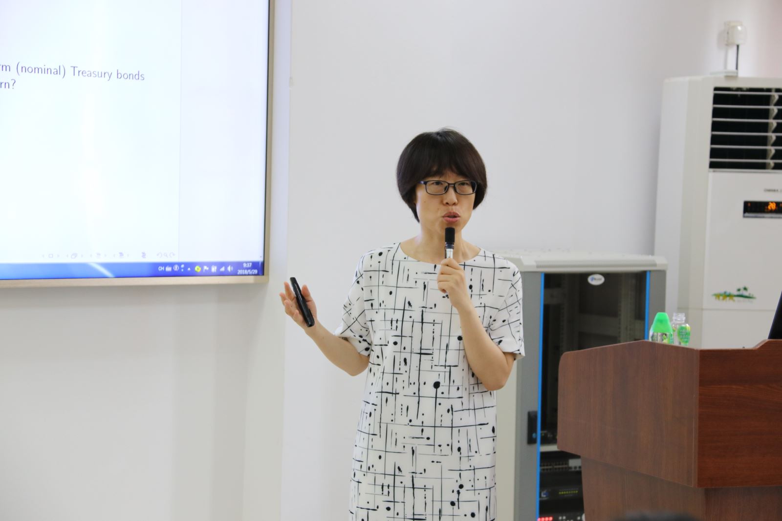 李学楠教授基于新凯恩斯模型,采用不同的货币和财政政策组合来解释市场投资组合的收益和长期国债之间的相关关系。李教授分别在AMPF和PMAF两种环境下,揭示了NT shock跟MEI shock 是经济波动和股票债券相关关系中的关键因素,同时通过1950s到2000s之间的数据对以上研究进行论证,为货币财政政策对股票债券方面影响领域的研究提供了新的洞见,使在场的学术型研究生以及本科生对这方面的知识有了更深刻的认识。