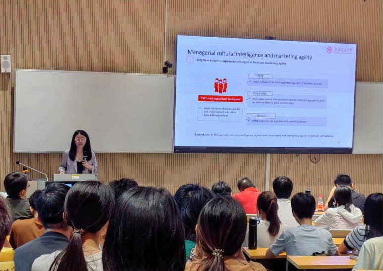首先由王倩博士开展题为“Managerial Cultural Intelligence and Marketing Agility of Foreign Subsidiaries”的主题分享。王博士以市场敏捷性为中心,基于上层理论,认为管理文化智慧是外国子公司市场敏捷性的重要前提,使子公司能够更好地理解和应对当地市场的变化。当市场竞争或市场动荡剧烈时,管理文化智慧对市场敏捷性的积极影响将会增强。
