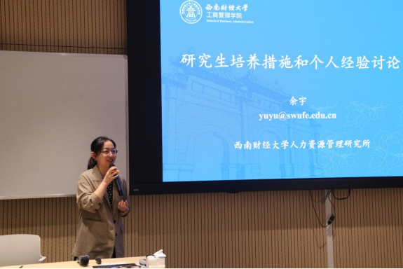 下午举行研究培养论坛,由李晨晨副教授和余宇博士分别带来《研究生幸福生活指南》和《研究生培养措施和个人经验讨论》的专题指导。李晨晨副教授从研究生幸福感模型展开分享,围绕“什么是幸福生活”以及“如何提升研究生幸福感”等关键议题,指导同学们在研究生学习期间如何认识自我、接纳自我、提升自我,从而获得有意义的研究生幸福生活。余宇博士以培养方案作为切入点,从文化氛围、师资力量、就业前景、培育成果等方面为大家展示了人力资源管理研究所在研究生培养方面的举措与经验,并结合个人作为研究生导师的经历,为同学们的职业发展规划提出了指导建议。最后,各位分享嘉宾与同学们进行了热烈的交流互动,就同学们关心的问题进行现场答疑解惑,让同学们受益匪浅。本次学术沙龙在掌声中圆满落下帷幕。