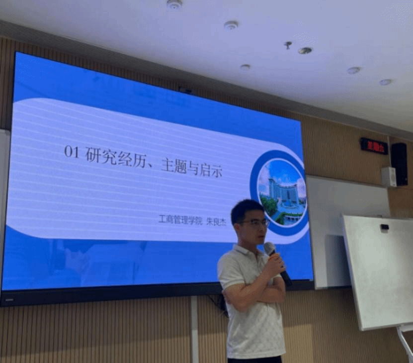 首先,朱良杰副教授做了题为《从“不知”到“有知”:研究的成长与心得》的主题分享。他结合自身读博与研究经历,分享了自身从事学术研究的四个成长阶段。他以讲述“四段故事”的方式,倾心讲述做一篇“好”研究、成为一位“好”研究者过程中的困惑、无趣、痛苦、收获与不足。朱老师充满真情的分享让现场的老师同学深深共情,赢得了大家的阵阵掌声。