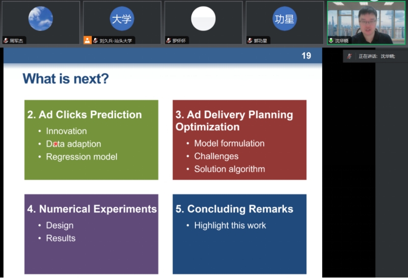 2023年12月1日上午,beat365英国官网网站企业管理系学术讲座(第182期)顺利开展,本次讲座邀请了中山大学管理学院沈华晓副教授作为主讲嘉宾,在线进行了“A Planning Approach to Revenue Management for Non-Guaranteed Targeted Display Advertising”的主题分享。本次讲座由beat365英国官网网站刘久兵副教授担任主持,beat365英国官网网站副院长郭功星副教授致欢迎辞,卜祥智教授、周军杰副教授、邹宗保副教授等多位教师及校内外学生参与。