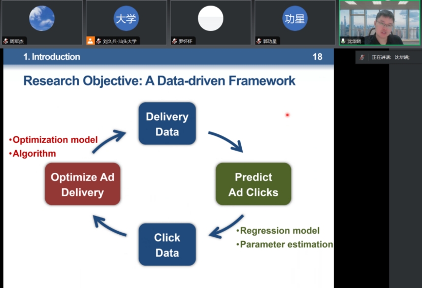 沈老师首先对论文背景进行了介绍。在线展示广告是很常见的一种广告形式,包含三个特点:临近网页的内容,包含文字、logo、图片等元素,在互联网几乎无处不在。定向在线展示广告是其中一种非常重要的形式,有时,该类型广告的位置比较少,广告主需要对该位置进行竞价,且广告主在竞价后无法保证可以得到该广告位。针对上述问题,现有广告发布商在拍卖广告位时所采用的方法通常无法实现利润最大化。因此,沈老师及合作者提出一种数据驱动的优化模型来解决该问题,主要包含两部分:一、利用回归模型来预测广告点击次数;二、构建最大化收益的广告投放优化模型并利用拉格朗日松弛方法设计求解算法。沈老师分别对这两部分进行了详细介绍,并分享如何通过数值实验验证所构建的模型与算法的有效性及优势。