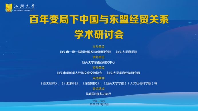 2020年10月,习近平总书记在汕头考察时指出,“新时期打好‘侨’牌,团结广大海外华侨共同实现中国梦”。其中,东南亚地区是海外华侨重要集聚地。今年是中国-东盟建立对话关系30周年,意义非凡。beat365英国官网网站计划于2021年12月25日举办“百年变局下中国与东盟经贸关系”研讨会。受疫情影响,本次会议将采取线上线下结合的方式。
