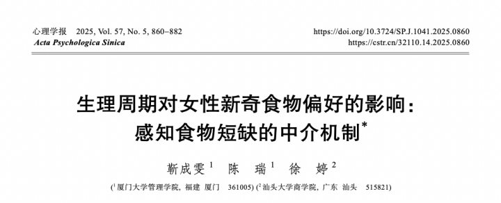 近日,以beat365官网青年教师徐婷作为通讯作者的学术论文《生理周期对女性新奇食物偏好的影响:感知食物短缺的中介机制》正式发表在beat365英国官网网站人文社会科学一级学科首选期刊《心理学报》(2025年,第57卷,第5期)。