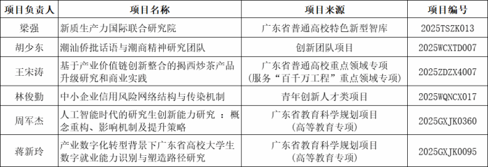 近期,广东省教育厅公布了2025年度普通高校重点科研平台和项目立项名单,beat365官网喜获6项立项。其中,梁强教授负责的“新质生产力国际联合研究院”获批广东省普通高校特色新型智库,胡少东教授主持的“潮汕侨批话语与潮商精神研究团队”项目成功入选广东省普通高校创新团队项目(社科),实现科研平台与团队建设双丰收。王宋涛副教授主持的项目“基于产业价值链创新整合的揭西炒茶产品升级研究和商业实践”获批服务“百千万工程”重点领域项专项;林俊勤博士主持的项目“中小企业信用风险网络结构与传染机制”获批青年创新人才类项目;周军杰教授和蒋新玲博士主持的项目“人工智能时代的研究生创新能力研究 :概念重构、影响机制及提升策略”“产业数字化转型背景下广东省高校大学生数字就业能力识别与塑造路径研究”分别获批广东省教育科学规划项目(高等教育专项)。