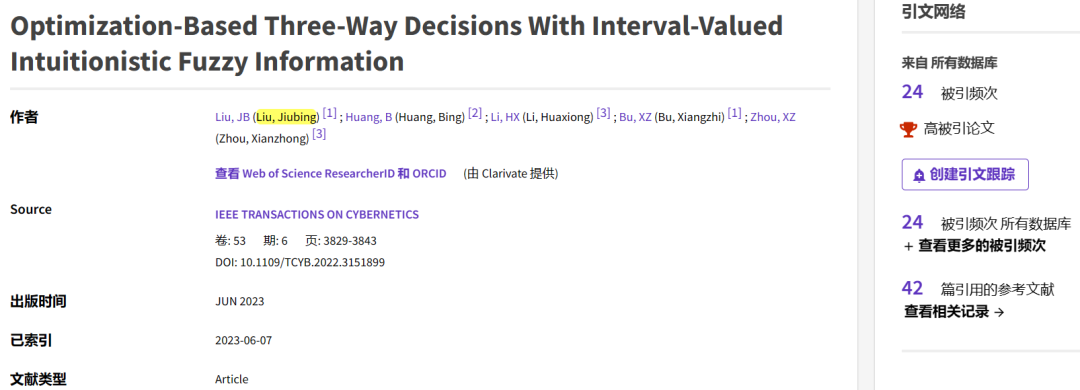近日,由beat365官网刘久兵博士作为第一作者兼通讯作者的论文成果“Optimization-Based Three-Way Decisions With Interval-Valued Intuitionistic Fuzzy Information”入选为ESI高被引论文。论文于2023年6月正式发表在人工智能领域国际顶级期刊《IEEE Transactions on Cybernetics》(中国科学院SCI一区TOP期刊,IF2022=11.8),根据科睿唯安(Clarivate Analytics)公布的最新数据,该成果自正式发表以来共在Web of Science被引用24次,其引用频次排名位于同学科领域的全球前1%。