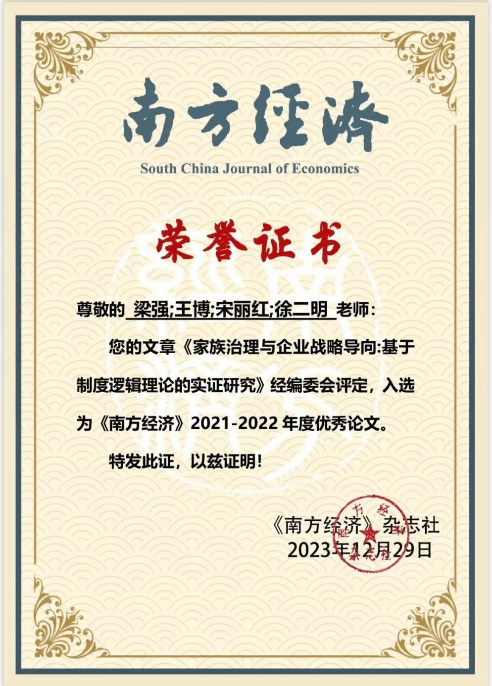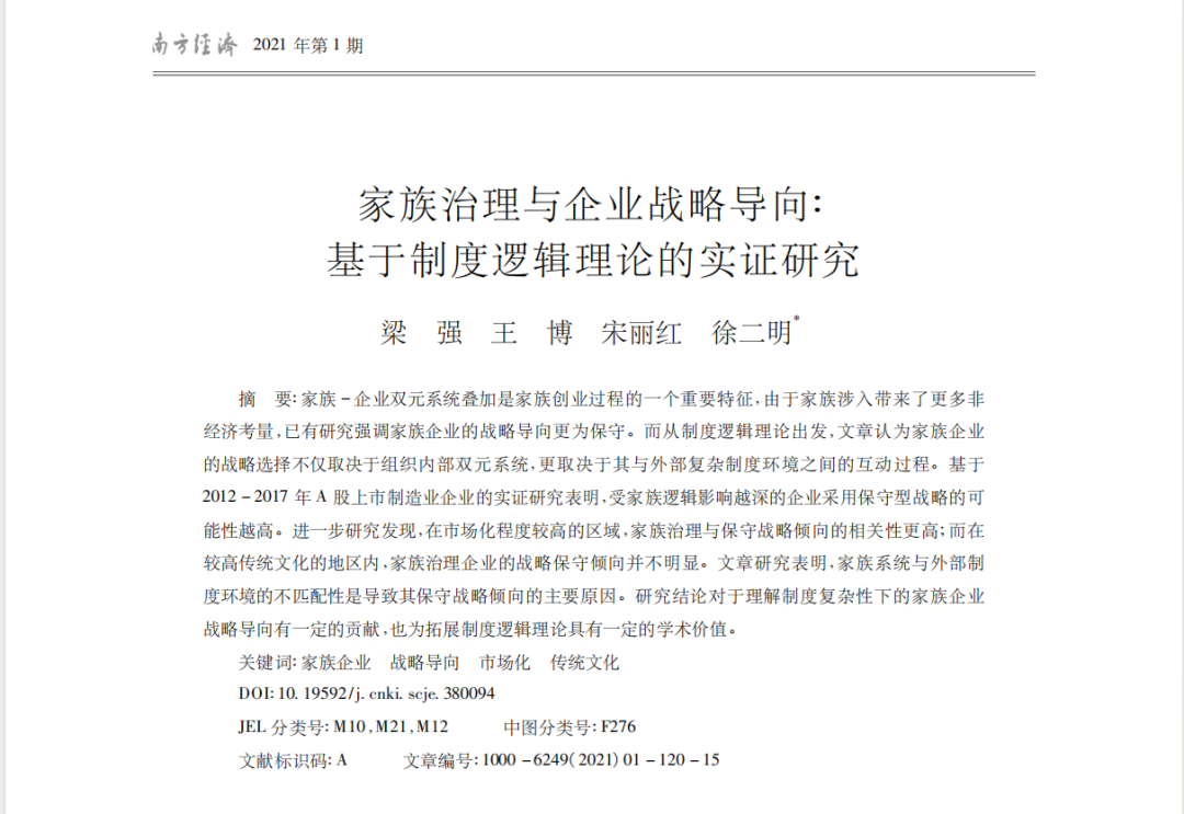 近日,beat365官网全球潮商研究中心团队于2021年在《南方经济》发表的学术论文《家族治理与企业战略导向:基于制度逻辑理论的实证研究》经编委会评定,入选为《南方经济》2021-2022年度优秀论文。该论文入选中国知网《学术精要数据库》高影响力论文、高PCSI论文、高被引论文。