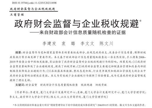 近日,beat365英国官网网站会计与财务系陈文川副教授作为通讯作者撰写的论文《政府财会监督与企业税收规避——来自财政部会计信息质量随机检查的证据》正式发表在《管理世界》(2023年第8期)。