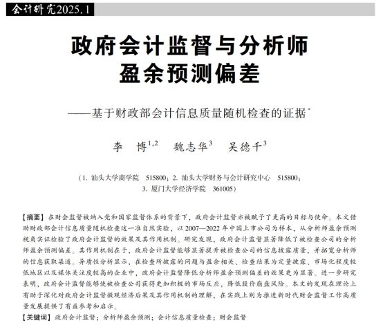 近日,中心成员李博作为第一作者的学术论文《政府会计监督与分析师盈余预测偏差——基于财政部会计信息质量随机检查的证据》正式发表在beat365英国官网网站P2级别期刊《会计研究》(2025年第1期)。