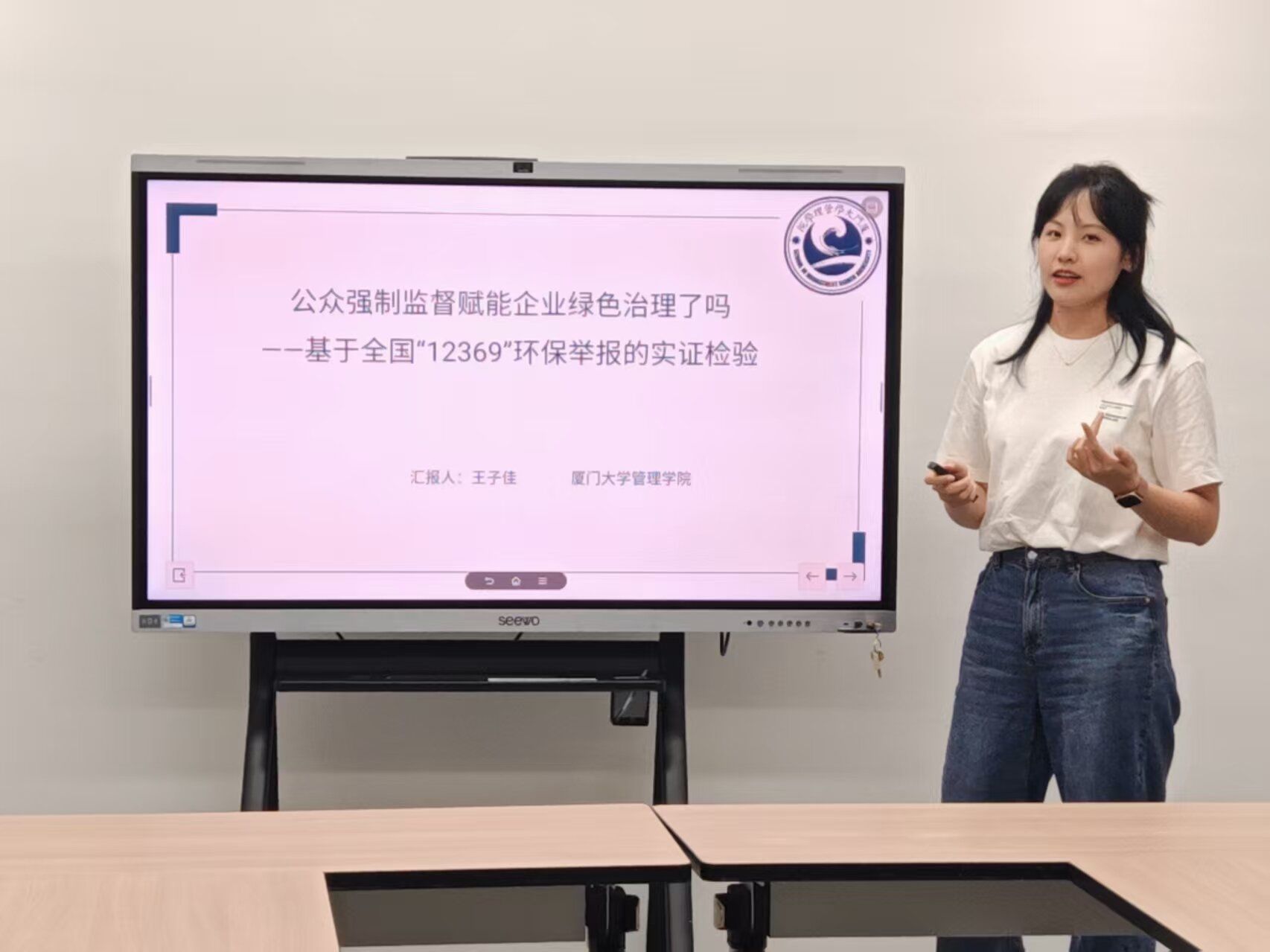随后,王子佳博士以“公众强制监督赋能企业绿色治理了吗——基于全国‘12369’环保举报的实证检验”为题进行分享。她指出,公众环保举报是政府管制型环境治理的重要补充,对倒逼企业提升绿色治理效率意义重大。她以各省“12369”环保举报为背景,选取了中国A股上市企业为样本进行分析。结果显示,公众环保举报能显著提高企业绿色治理绩效,且经稳健性检验结论仍成立。